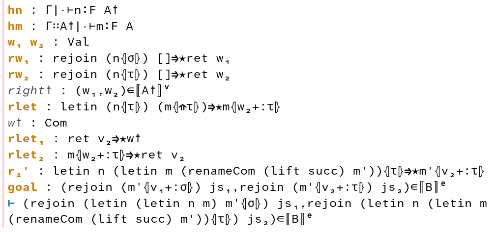 There are a lot of nice monospaced code-writing fonts that I don’t use. For some of them, there are tiny, specific nitpicks about why I don’t use them. My use case is writing code with a lot of Unicode, like in Lean or Agda, writing Markdown with a lot of Unicode because I can, and having a terminal that looks nice. For reference, I’ll be comparing a snippet of a proof state I have open at the moment, and my default font of choice is currently Fira Code.